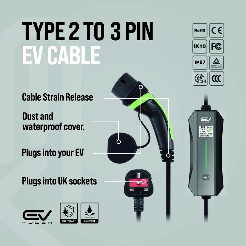 This cable allows electric vehicles with a Type 2 socket to charge from a standard UK 3-pin domestic outlet. It provides a slower charge but is useful for home or emergency charging when dedicated charging stations aren't available.