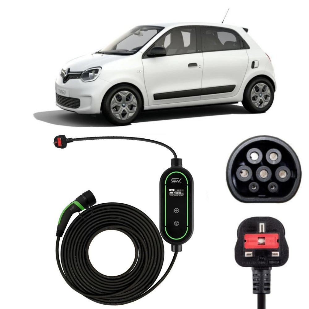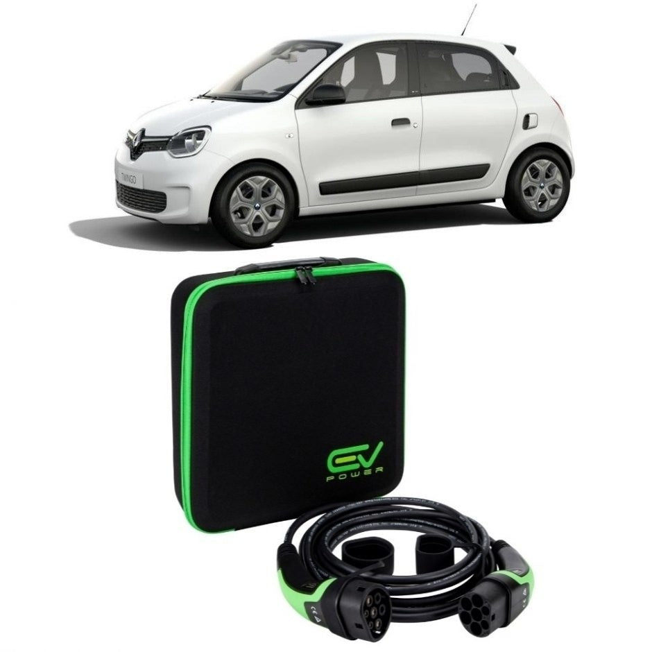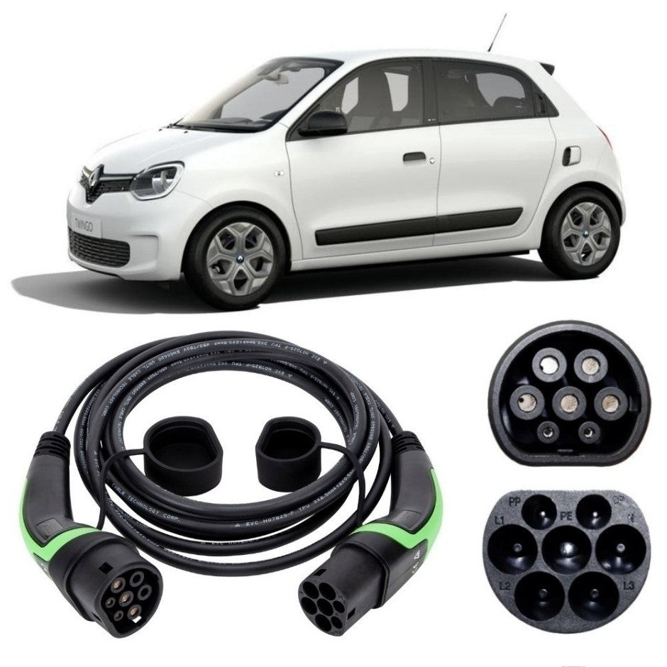 The Renault Twingo ZE is a full electric vehicle (BEV), Battery Electric  Vehicle.  Charging is done by using a Type 2 charging cable which we stock in 2 lengths: 5m and 10m but other lengths are available on request.  The onboard charger has a maximum power of 22kw and can be charged fully in around 1 hour 15 minutes as the table shows, this however depends on the charging stations output.